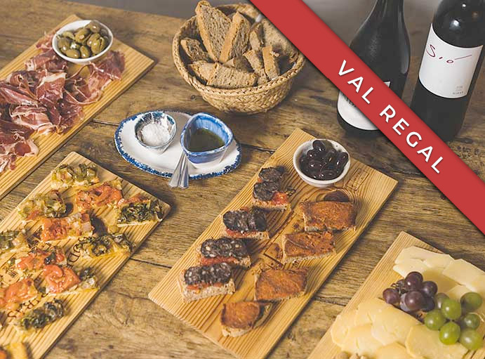 Visita guiada al celler i tast d'una selecció de 4 vins, acompanyada de taules de pernil ibèric de Jabugo, formatges de les Illes Balears, ametlles i olives mallorquines, fruita seca, pà moreno tradicional i oli d'oliva Verge Extra Ribas amb flor de sal.